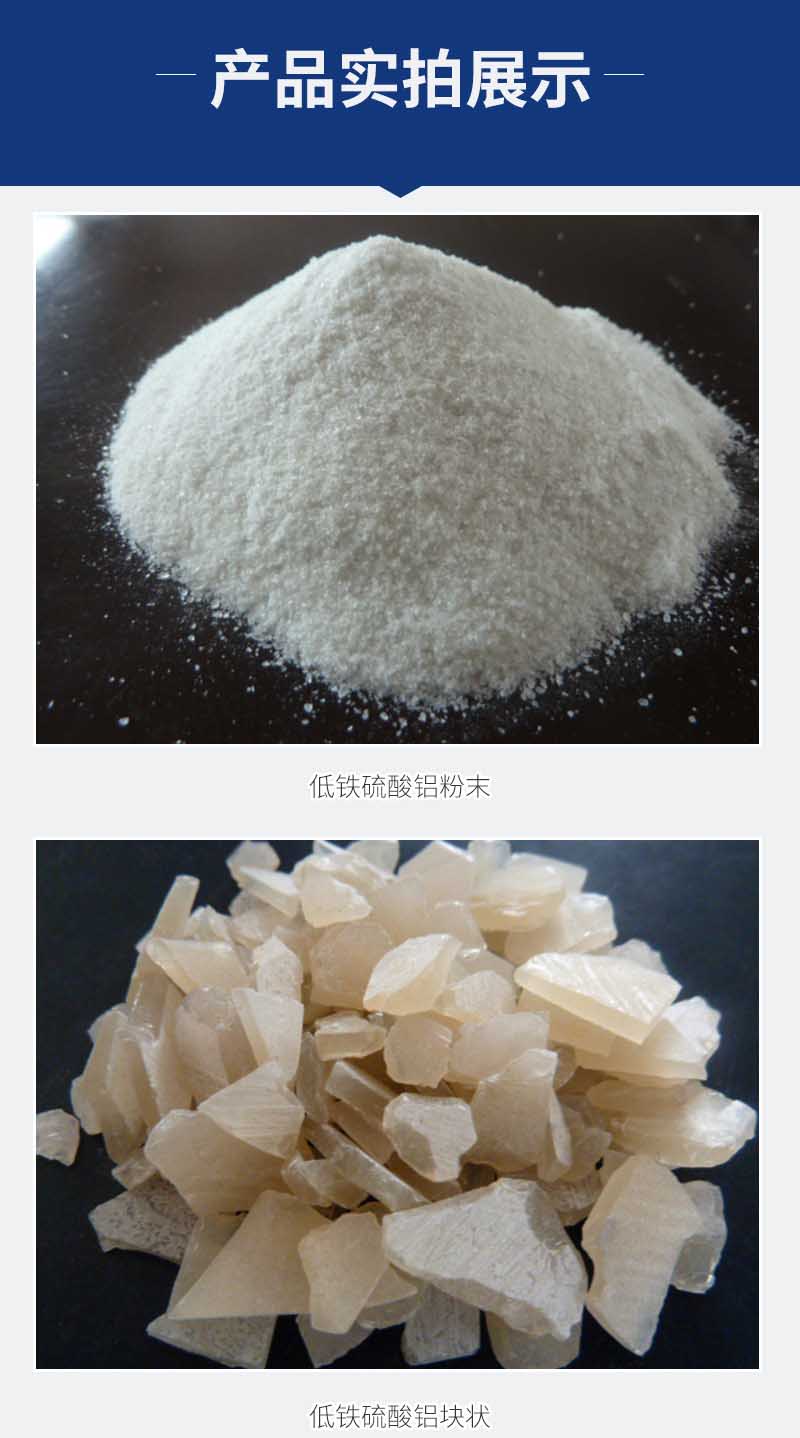 造紙工業(yè)中作為松香膠、蠟乳液等膠料的沉淀劑,水處理中作絮凝劑,還可作泡沫滅火器的內(nèi)留劑,制造明礬、鋁白的原料,石油脫色、脫臭劑、某些藥物的原料等。還可制造人造寶石及高級(jí)銨明礬。砷含量不大于5mg/kg的產(chǎn)品可用于水處理絮凝劑。 [9]