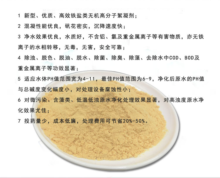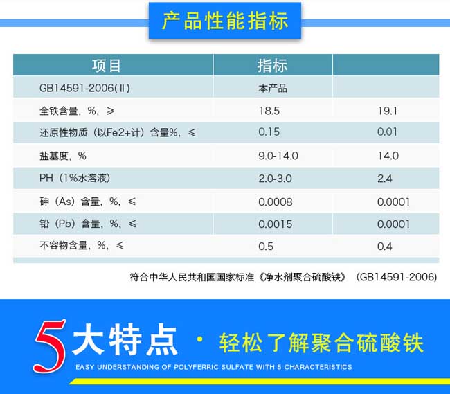 | 全含鐵量%(固體)≥19.5 | 還原性物質(zhì)(以計(jì))含量% ≤0.15 | 鹽基度% 5.0-20.0 | PH (1%的水溶液)1.5-3.0 | 砷(As)% ≤0.001 | 鉛(Pb)%≤0.002 | 不溶物含量%≤0.6 |